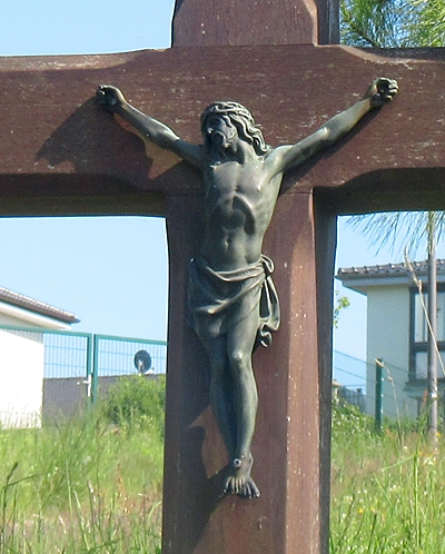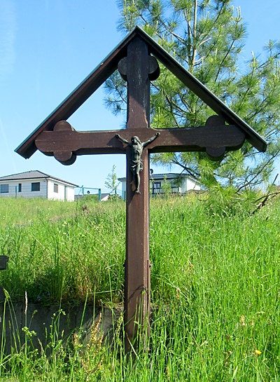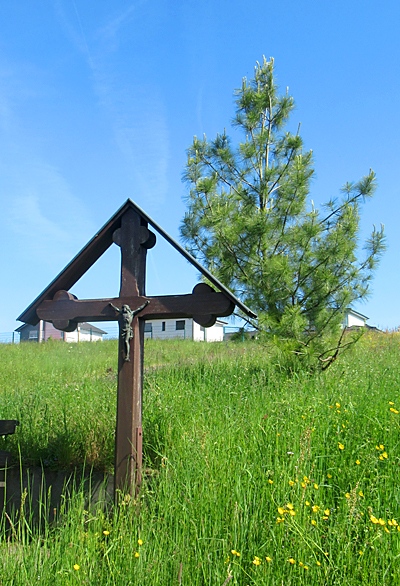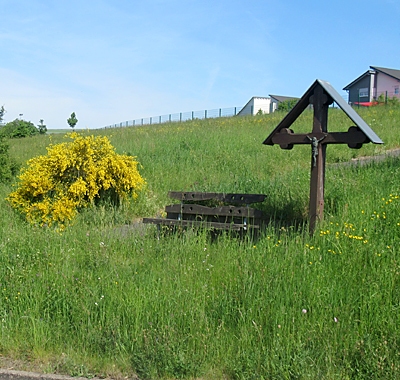 Balkenkreuz aus Holz, Balkenenden kleeblattförmig verziert, mit Schutzdach und gusseisernem Korpus, Rastbank daneben. [1]