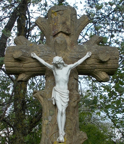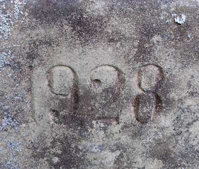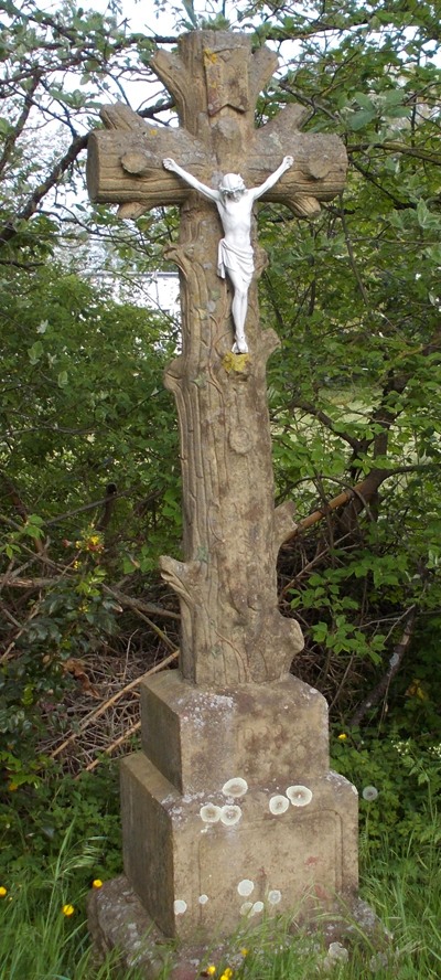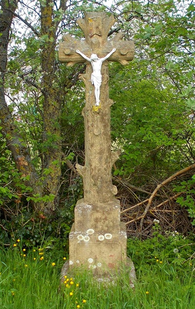 Steinernes Wegekreuz mit Baumstamm nachempfundenen Verzierungen, Jahreszahl 1928 im 2. Sockel eingemeißelt. [1]