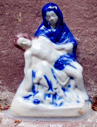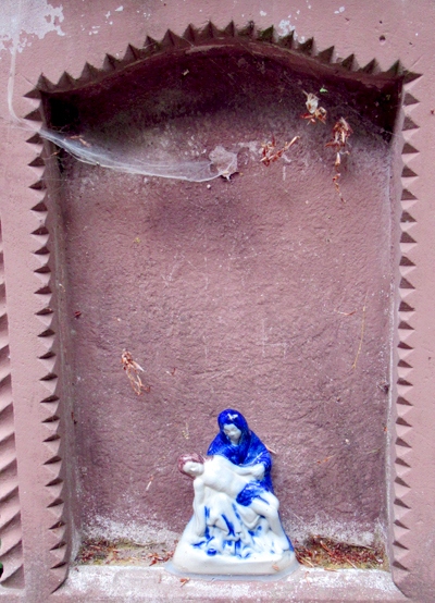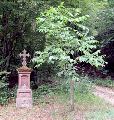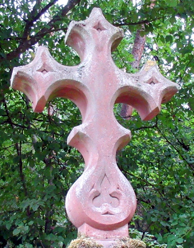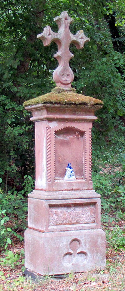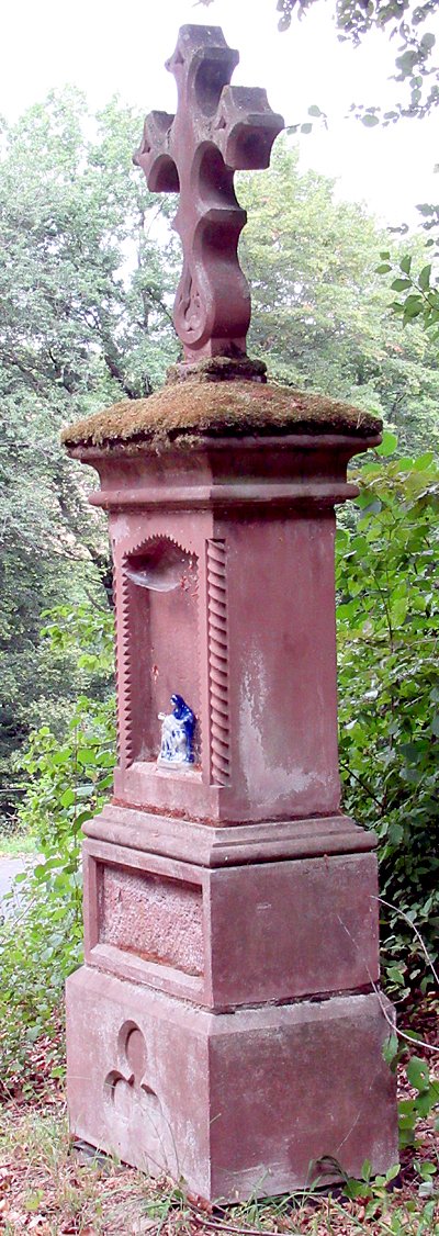 Pfeilerschaftkreuz aus Rotsandstein. Sockel mit Verzierung, in der Mitte Bildnische mit kleiner Keramik-Pietà, Abschlusskreuz verziert. [1]