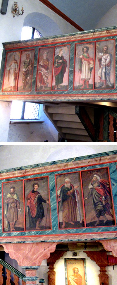 Der Enkircher Pfarrer Pfarrer Pfender weihte die Kirche am 30. Juni 1765, und elf Jahre danach malten Jakob Homburg und J.Peber für dreißig Reichstaler die Wände mit Steinfarben und die perlfarbig aus und schufen außerdem ein Dreifaltigkeits-Chorbild. Allerdings stammen die noch heute vorhandenen Malereien an der Westempore kaum von den beiden Künstlern. Die zeigen die zwölf Apostel und die sieben Propheten.