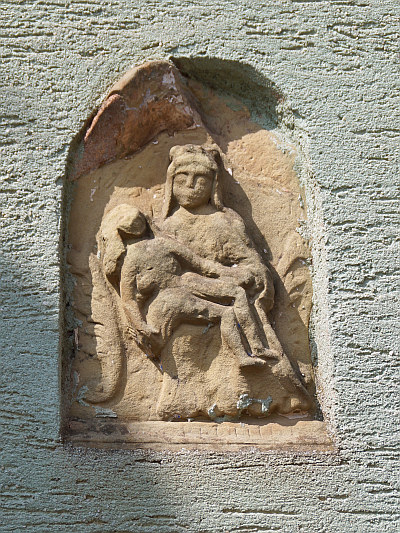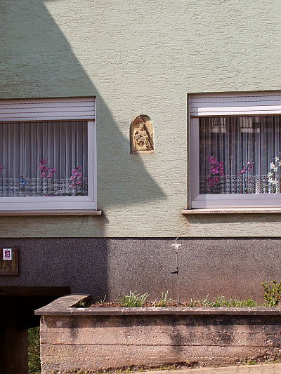 In die Hausfront nischenförmig eingemauertes Relief in derber Formsprache, ehemals wohl von einem Bildstock des Klausener Typs. [1]
