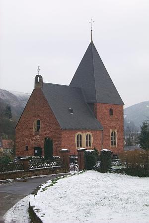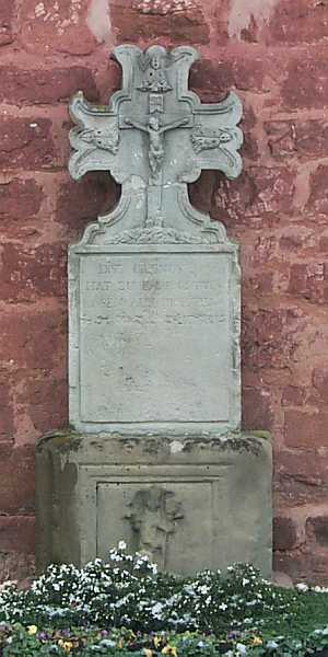 An der Außenseite der Filialkirche aufgestellt ist ein von der alten Kirche hierher übertragenes Wegekreuz, ursprünglich wohl in Verbindung mit der Saarschifffahrt. Das Rotsandsteinunterteil ist mit der Relieffigur des heiligen Nikolaus als Sockel für das 1878 datierte Stelenkreuz aus weissem Sandstein wiederverwendet. Dieses mit verwitterter Inschrift und detailreichem Abschlußkreuz. [1]