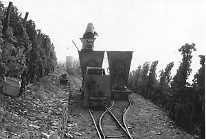 Die Bahn erschloss 14 Hektar Weinbergsfläche und besaß weder Loks noch Kübelwagen für die Weinernte. Die Ernte wurde in Holzbütten, die auf Flachwagen befestigt waren mit Hilfe von Pferden zum Wirtschaftsgebäude transportiert. Im Zuge der Flurbereinigung wurden die Gleise entfernt und die ehemalige Trasse zu Wirtschaftswegen ausgebaut. Im Aveler Tal bei Trier das 1901 für den Weinbau erschlossen wurde, überdauerte die Feldbahn bis Anfang 1978. Die nur 2,8Kilometerlange Bahn erschloss 31 Hektar.