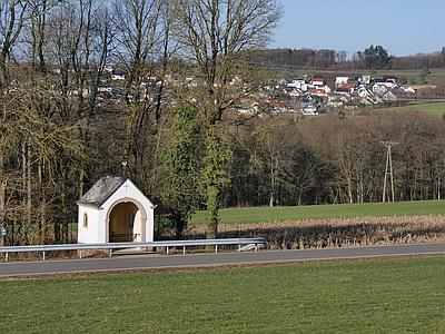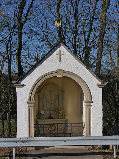 An der Straße, die Lorich mit Butzweiler verbindet, steht diese kleine Kapelle. Es ist eine Stiftung der Loricher Bürger zum Dank dafür, dass der Ort und seine Menschen von den Wirren des Krieges verschont blieben. Sieben Loricher zogen damals in den Krieg und alle sieben kehrten sie unversehrt zurück. Die kleine Kapelle wurde im Jahr 1946 von Helena Boesens Vater, Matthias Haubrich, einem Steinmetz erbaut. Auch die Steine hat er gebrochen und bearbeitet.