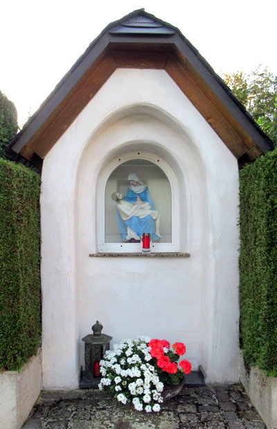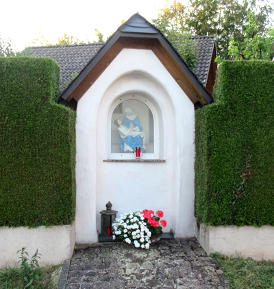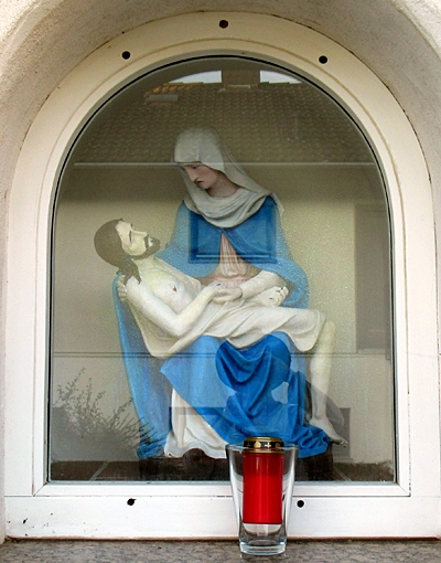 Heiligenhäuschen mit Pietà, in begrünter Begrenzungsmauer eingefügt. [1]