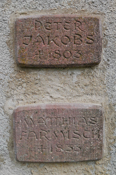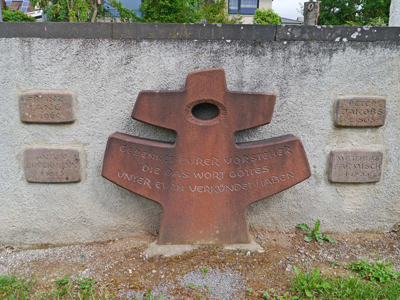 An der Mauer sind Tafeln mit den Namen der verstorbenen Darscheider Pastöre angebracht.