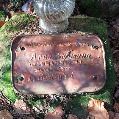 Hier starb am 9. II.1945 Arno Bachmann aus Limbach bei Hbg Saar geboren 24.II.1927 den Heldentod