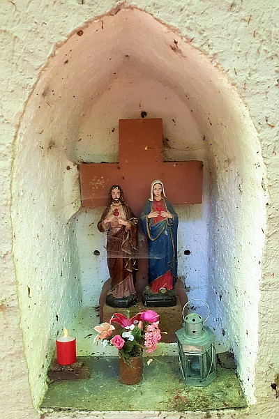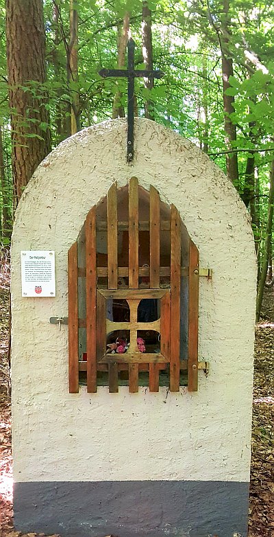 Nische mit Kreuz im Halbrelief, heute mit zwei dazugestellten Gipsfiguren. Ziel der ersten Bittprozession an den Bitttagen. [1]