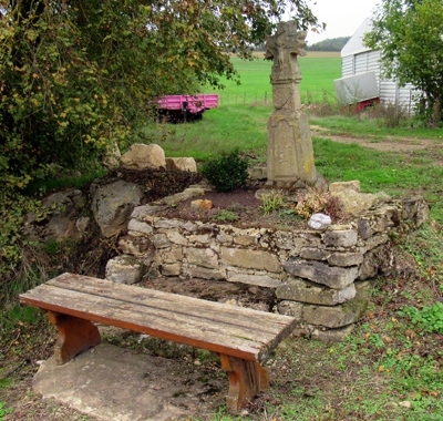 Kreuz liebevoll gestaltet mit Blumenbeet und Sitzbank davor. [1]