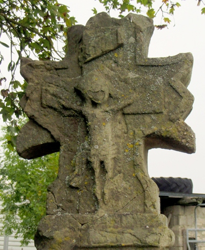 An Insignien am Sockel noch IHS und ein Herz (Wundmale) erkennbar. Abschlußkreuz mit reliefiertem Korpus, verwittert.