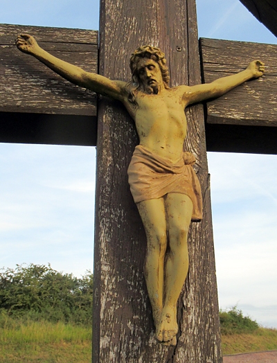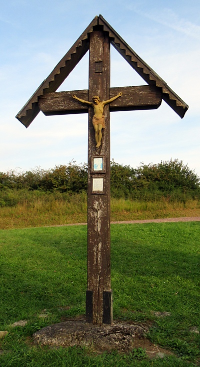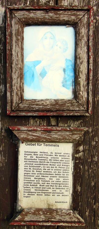 Hohes Holzkreuz mit Schutzdach, Korpus vorhanden. Am Holzschaft kleines Heiligenbild und Gebet für Temmels angebracht. Drumherum Aussichtspunkt mit Infotafeln und Rastbänken. [1]