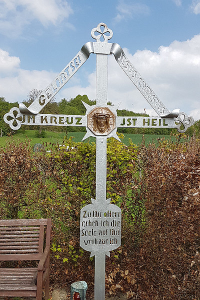 Inschriften: GELOBT SEI JESUS CHRISTUS - IM KREUZ IST HEIL - Zu Dir o Herr erheb ich die Seele auf Dich vertraue ich. [1]