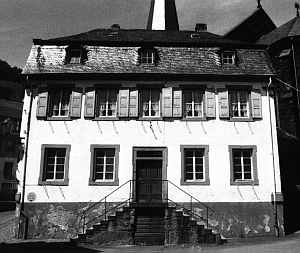 Das spätbarocke Haus unterhalb der Kirche wurde mit seiner doppelten Treppe 1782 als Pfarrhaus gebaut und diente später als Frühmessnerhaus. Wurde Ende der 80er Jahre liebevoll renoviert. Vor dem Haus ein Brunnen, der völlig vergessen war und unter der Straße verborgen lag. Eingelassen in der Hauswand ein ehemaliges Wegkreuz aus dem 16. Jahrhundert.