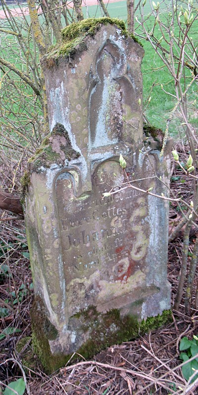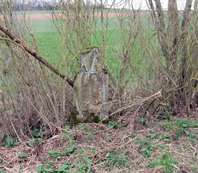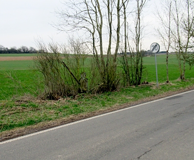 Bildstock / Schrifttafel im Gehölz an Straßenrandböschung, verwittert, Inschrift schwer lesbar. [1]