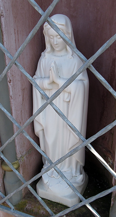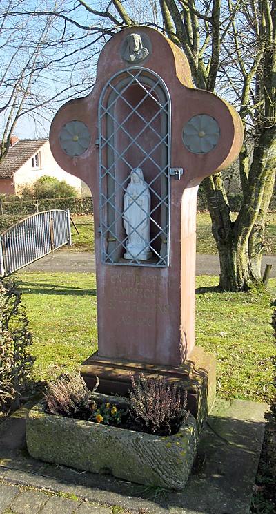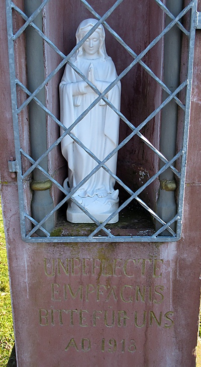Bildstock mit Nische, vergittert. Im Inneren eine kleine Muttergottes-Statue.