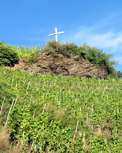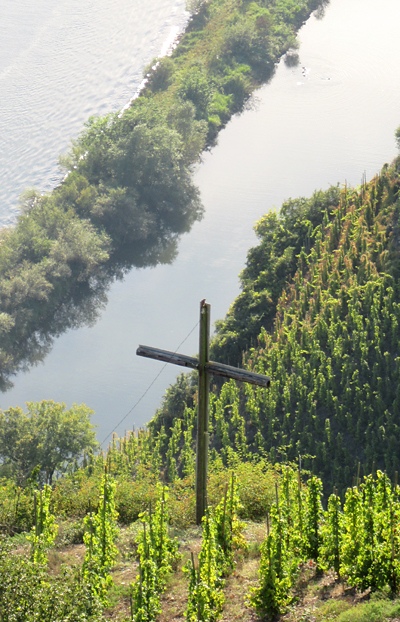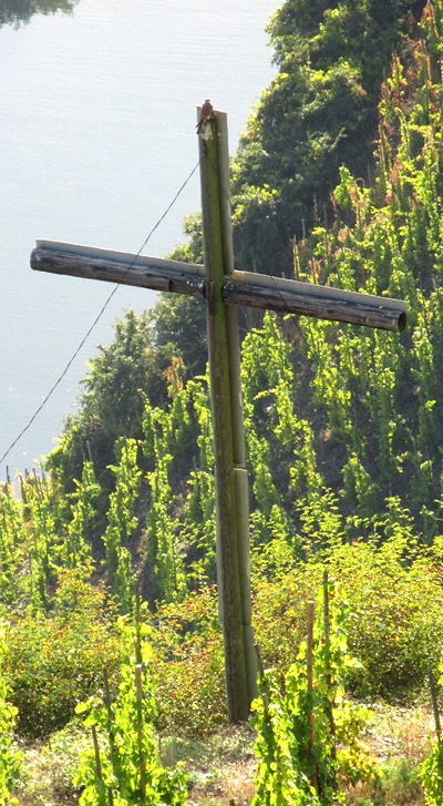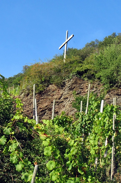 Ca. 2,50m hohes Holzkreuz auf vorgelagertem Schiefer-Bergsporn in steiler Weinbergslage Erdener Burg. [1]