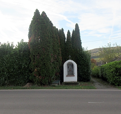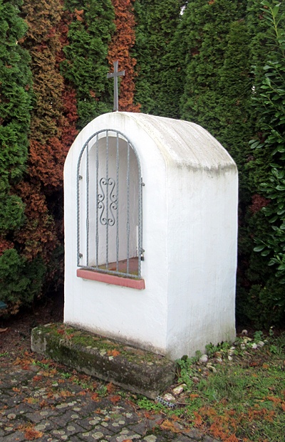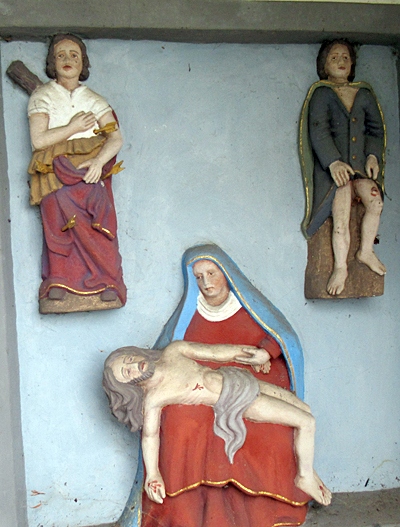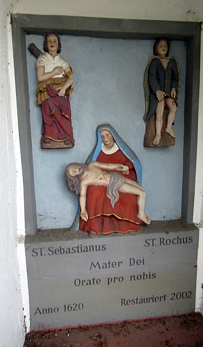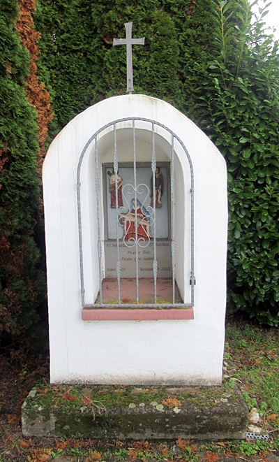 Rund geschlossener verputzter Mauerblock mit Rundbogennische, vergittert. Im Inneren eine Pietà und zwei weitere Heiligenfiguren (St. Sebastianus und St. Rochus).