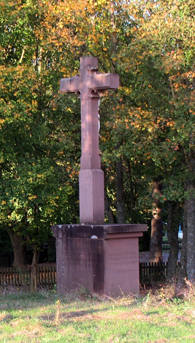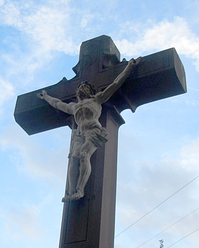 Mächtiges Altarkreuz aus Sandstein, gotisch verziertes Abschlusskreuz mit Korpus.