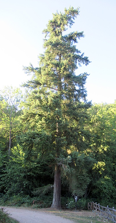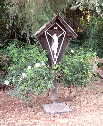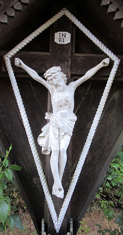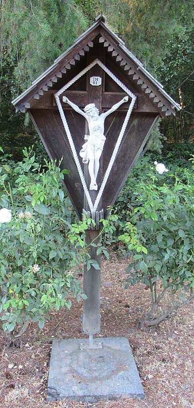Holzkreuz mit Sattel-Schutzdach, weißer Korpus, unter einer mächtigen Fichte an einem Teich am Föhrenbach gelegen. [1]