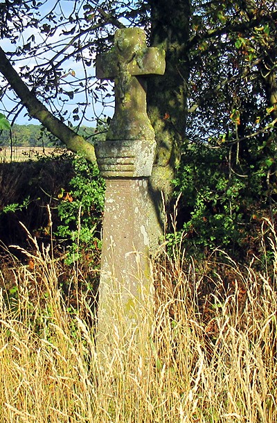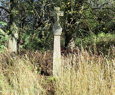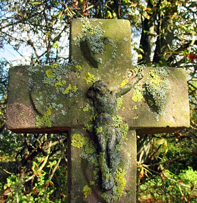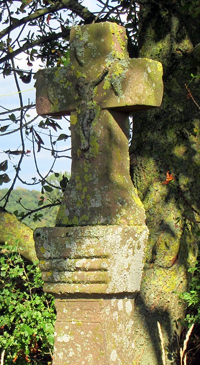 Schaftkreuz aus Sandstein, reliefierter Korpus [beschädigt] und Ornamente am Kreuz, verwittert. [2]