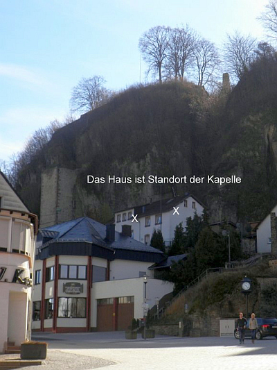 [...] Außer der Pfarrkirche bestanden Kapellen auf der Burg und im Tal. Für diese beiden errichtete Graf Dietrich im Jahre 1486 zusammen mit dem Junggrafen Coyn (Kuno) und Johann sowie dem Schultheis und den Schöffen zu Gerolstein aufgrund von Vermächtnissen des Clais Hulman und des Peter Hoyntze die Stelle eines Priesters, der die Kapelle auf der Burg und die neugebaute und im Jahre 1487 durch den Generalvikar des Erzbistums Köln geweihte Kapelle im Tal versehen soll. Der Priester erhielt durch Schenkung ein Burghaus, das dem Thomas von Gense gehört hatte.