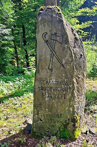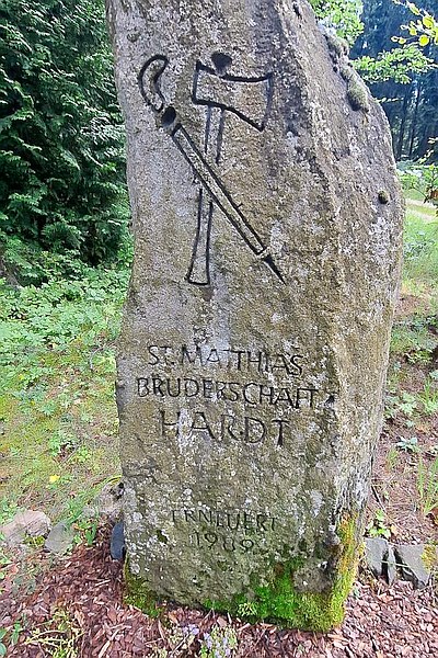 In den 60 er Jahren fuhr der Brudermeister Hermann Opgenorth ohne Wissen des Vorstandes in die Eifel und führte in Koop Gespräche mit einigen Bewohnern des Ortes um die Erlaubnis zu erhalten ein Pilgerkreuz aufzustellen. Die Erlaubnis wurde ihm erteilt. So stellte er, an der Stelle an der heute der Pilgerstein steht, ein Kreuz auf mit der Aufschrift „Matthaisbruderschaft Hardt“. Vom Vorstand verlangte er dann die Erstattung der Kosten in Höhe von 100,00 DM. Der Vorstand willigte ungern ein. Nicht alle waren einverstanden. Die Aufstellung des Kreuzes war umstritten. So kam es, dass bei den nächsten Wallfahrten einige Brudermeister beim Kreuz Pause machten und die „Fünf Wunden“ beteten und wieder andere stur daran vorbeizogen.