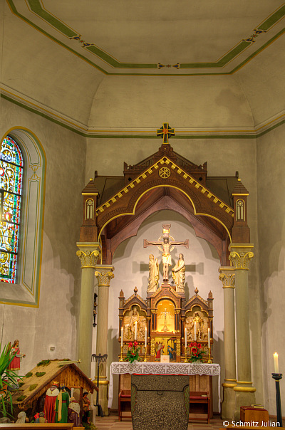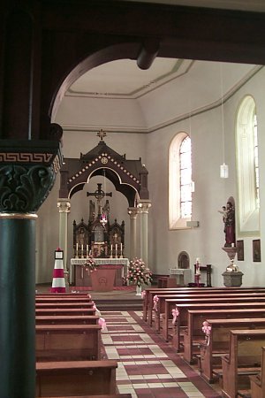 Das Innere mit Voutendecke, Resten der nachbarocken Ausstattung und der in den 1910er Jahren geschaffenen neuen Ausstattung in vom Jugendstil beeinflußten neuromanischen Formen. Der Altar unter Ziborium aus kompositen Steinsäulen mit hölzerner Überdachung. Der Steinaltar (bezeichnet A. Thönes, Wittlich, 1912) mit dreiteiligem Aufbau; beidseitig des Kruzifixes Figuren der Heiligen Klemens und Rochus; bekrönende Kreuzigungsgruppe. Zeitentsprechend ein Vesperbild in Nischenrahmung, die Steintaufe, marmorierte Heiligenfiguren des heiligen Josef und heiligen Antonius sowie die Maria Immakulata in der Kapelle.