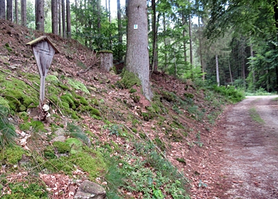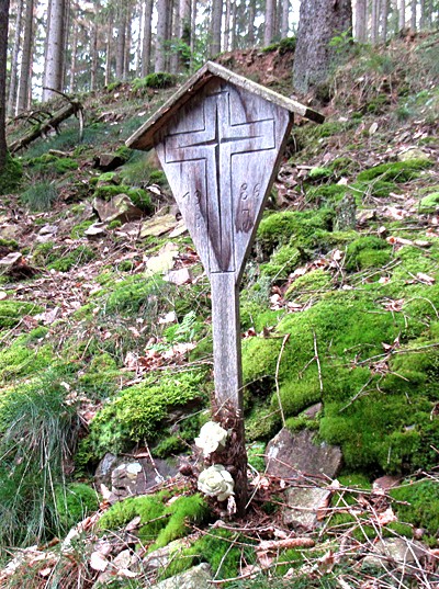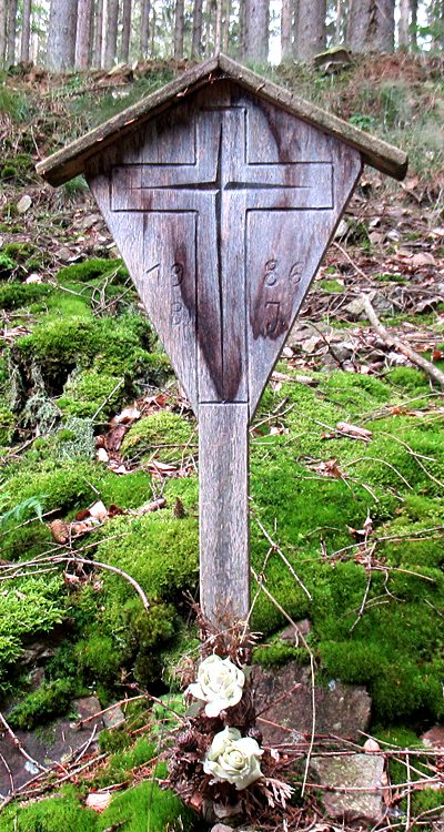 Schlichtes Holzkreuz mit Schutzdach, ohne Korpus.