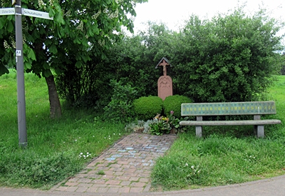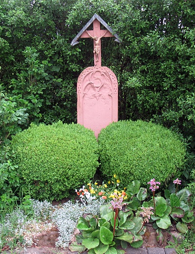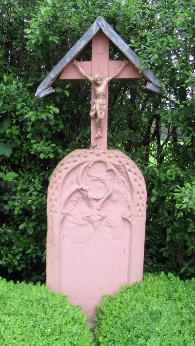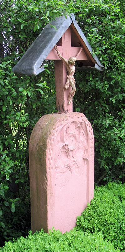 Sandsteinkreuz in Schrifttafelform, mit Ornamenten verziert. Abschlußkreuz mit Korpus und Sattelschutzdach. [1]