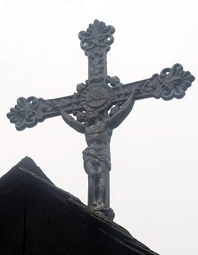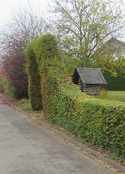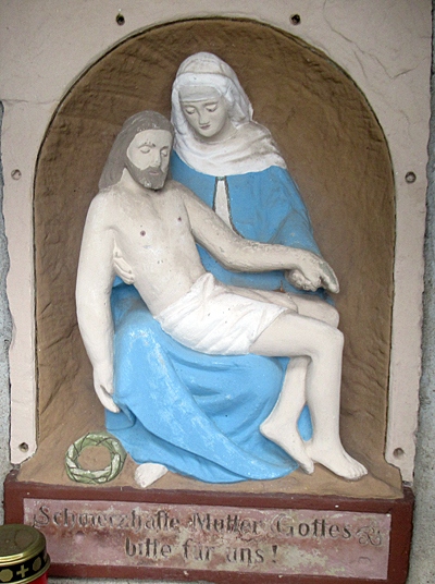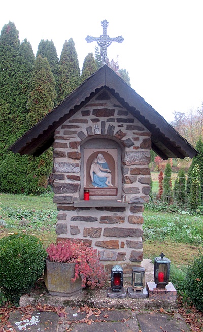 Heiligenhäuschen aus Moselschiefer-Bruchstein. In der Nische eine reliefierte Pietà. Gusseisernes, verziertes Abschlußkreuz.