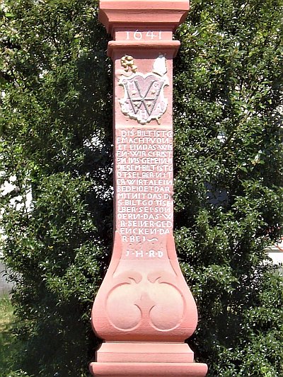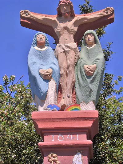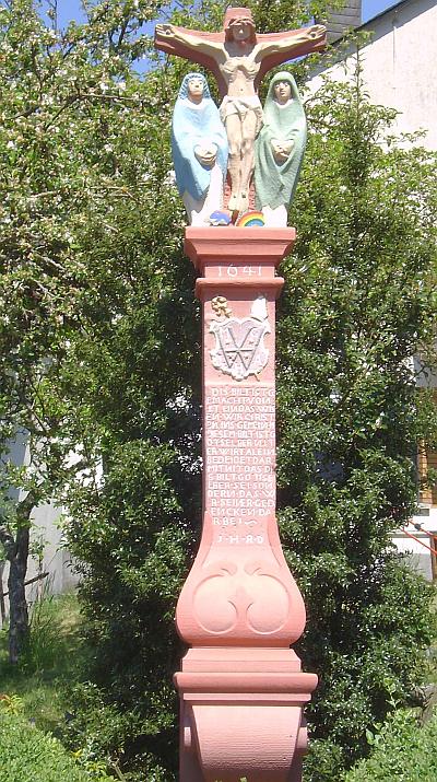 Wappen und Initialen weisen auf den Stifter hin. Mehrfach restauriert. Die heutige Kreuzigungsgruppe stammt vom Wittlicher Bildhauer Hanns Scherl. [1]