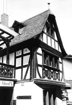 Ein typisches Schieferhaus aus dem frühen 19. Jahrhundert. In der Umwehrung des Hofes befinden sich an der rechten Außenseite zwei längliche Löcher, Schießscharten könnte man meinen. Doch weit gefehlt. Die Löcher dienten den Schrötern als Durchlaß für ihre Taue, mit denen sie Fässer aus dem Keller zogen. Schröter war eine Berufsbezeichnung, nämlich für die damaligen Transportunternehmer. Waren die Keller voll und sollte der Wein zum Kunden, kamen die Schröter. Wuchteten die Fässer aus den Kellern, luden sie auf Schiffe und transportierten den Wein dahin, wo er hin sollte.