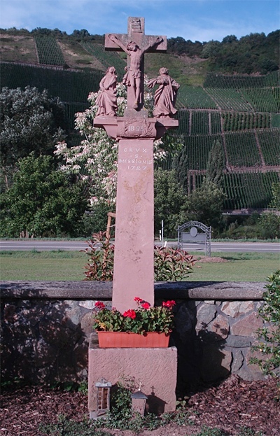 Kreuzigungsbildstock, heute Friedhofskreuz. Jetzt an der Kapelle aufgestellter, durch Inschrift am glatten Pfeilerstock als Missionskreuz bezeichneter und 1727 datierter Bildstock. Die vollplastische Kreuzigungsgruppe laut Datierung am Tragbalken wohl 1823 erneuert und 1990 nach mutwilliger Zerstörung restauriert und ergänzt. [1]