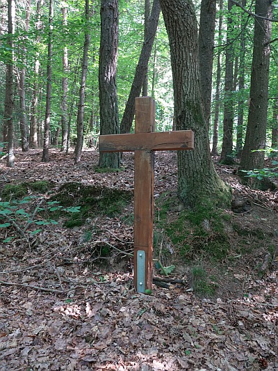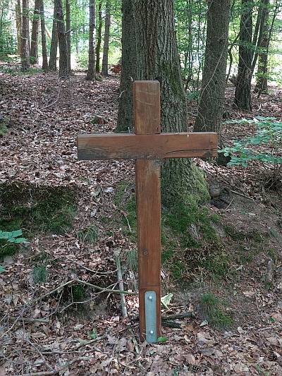 Uraltes Eichenholzkreuz am ehemaligen Fuhrweg nach Retterath. Es ist ein Totengedächtniskreuz, an dieser Stelle soll ein Mann plötzlich verstorben sein. []