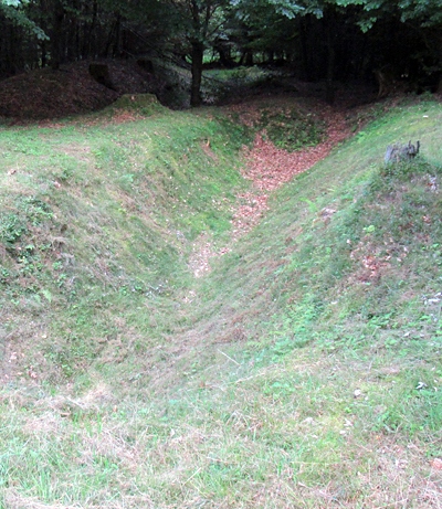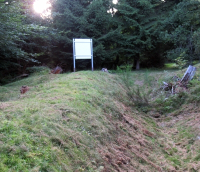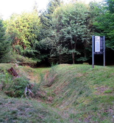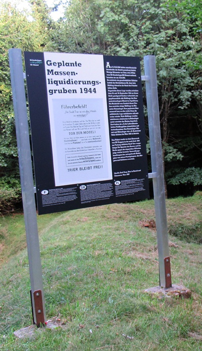 Angesichts dieser Lage wurden zwischen dem 10. und 18. September 1944 an dieser Stelle genügend Gruben vorbereitet, um gegebenenfalls alle Häftlinge des Konzentrationslagers Hinzert zu liquidieren. Die Nachricht vom Aushub dieser Gruben erreichte einige Häftlinge im Hinzerter Stammlager. Zum geplanten Massenmord kam es aber nicht. Denn die militätische Lage stabilisierte sich zeitweise wieder. Viele Häftlinge wurden stattdessen schubweise in Nebenlager meist ostwärts des Rheins deportiert. Dort hatten sie z.B. für Luftwaffeneinheiten Feldflugplätze einzurichten und instandzusetzen. Das Stammlager Hinzert und Nebenlager wie z.B. Neubrücke/Nahe blieben bis März 1945 in Betrieb. [...] [1] [3]