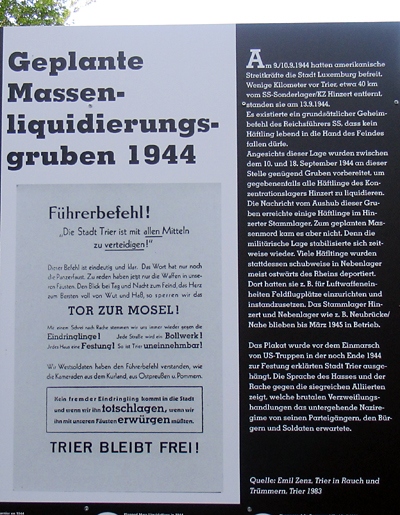 Am 9./10.9.1944 hatten amerikanische Streitkräfte die Stadt Luxemburg befreit. Wenige Kilometer vor Trier, etwa 40 km vom SS-Sonderlager/KZ Hinzert entfernt, standen sie am 13.9.1944.