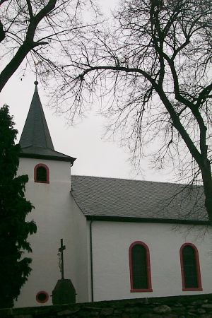 Romanischer Westturm, Saalbau von 1820/21; neugotisches Kirchhofskreuz, bezeichnet 1846. [1]