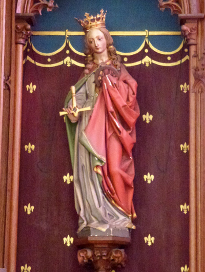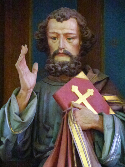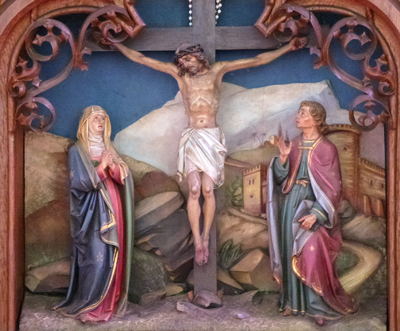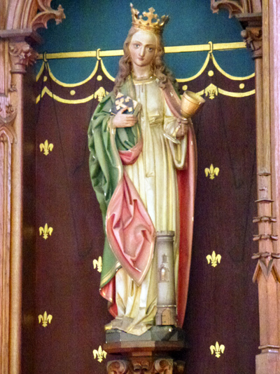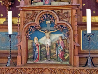 Neugotischer Altar vom Trierer Holzbildhauer Karl Frank, dreiflügelig aus dunkel gefasstem Holz mit filigranem Gesprenge, die Figuren farbig gefasst, hl. Markus, flankiert von den hll. Barbara und Katharina, in der Predella Kreuzigungsrelief. [1]