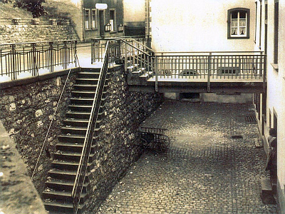 Über das historische "Dreestreppchen" eilten die Sprudelarbeiter und -arbeiterinnen mit ihren genagelten Schuhen zu ihren Arbeitsplätzen beim "Gerolsteiner Flora Brunnen" und beim "Gerolsteiner Sprudel" hinab und gingen abends dann wieder Richtung Heimat. Sie kamen von Büscheich / Niedereich und Michelbach zu Fuß nach Gerolstein.
