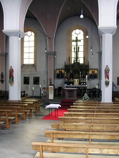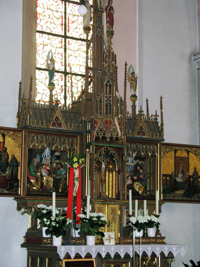 Der 1895 angeschaffte neugotische Hochaltar, ein filigran geschnitzter Flügelaltar mit mittlerem Tabernakelbaldachin, Relief und Gemäldetafeln mit Darstellungen aus dem Leben Jesu. [1]
