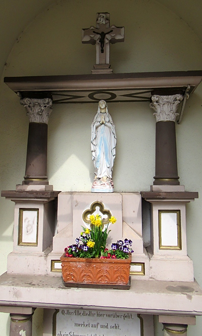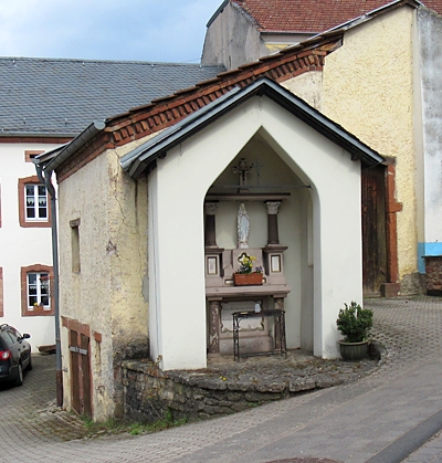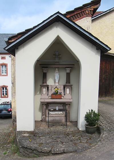 Muttergottes-Kapelle, direkt an Wirtschaftsgebäudeteil angebracht. Im Inneren Altartisch mit kleiner Muttergottes-Statue.