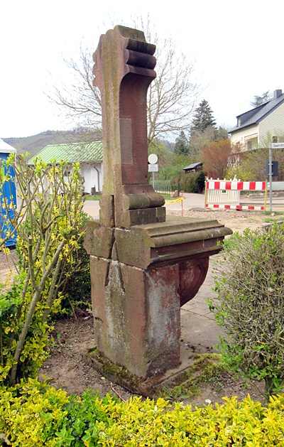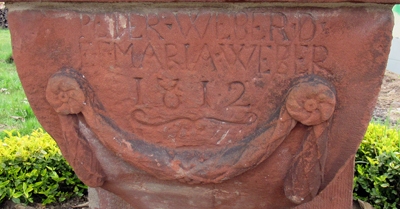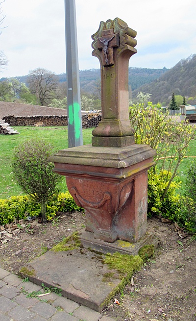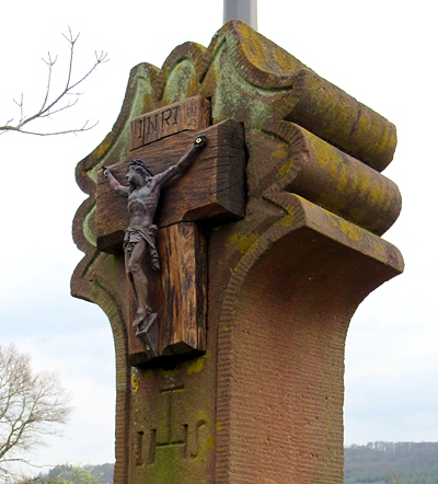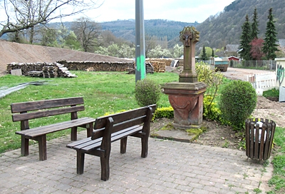 Pfeilerschaftkreuz mit ausladenem, verzierten Sockel/Altartisch und Abschlußkreuz.