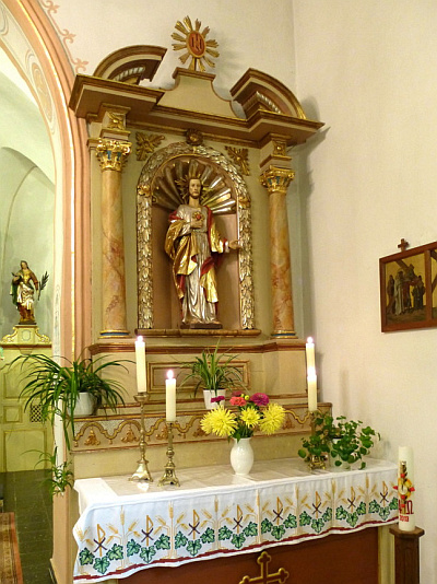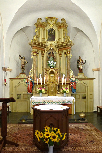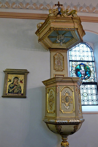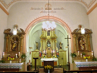 Alte Rehlinger Kirche Sankt Jakobus. Die Kirche liegt, von einem Friedhof umrahmt einsam in einem Wiesental. Romanischer Turm. Schiff aus dem 18. Jahrhundert (möglicherweise 1725). Schöne barocke Innenausstattung aus dem 18. Jahrhundert Interessante Orgel.