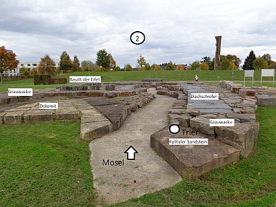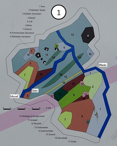 Zur Landesgartenschau 2004 in Trier auf dem Petrisberg wurde als Kooperationsprojekt der Stadt Trier mit dem Landesamt für Geologie und Bergbau Rheinland-Pfalz und der Universität Trier, Fachbereich VI Geologie eine Karte von Rheinland Pfalz erstellt [Bild 1]. Sie ist aus Steinblöcken der 17 hauptsächlichsten Gesteinsarten geformt. Die großen Flüsse Mosel und Rhein lassen eine leichte Einordnung zu.