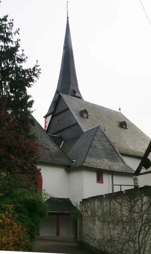 Malerische Baugruppe oberhalb des Dorfes. Dreiachsiger Saalbau von 1718. Sakristei 15. Jahrhundert, Orgel 1754-60 von Joh. Philipp und Joh. Heinrich Stumm. Bildnisgrabsteine von 1528. Geschnitztes Epitaph Peter Molitor, um 1670.