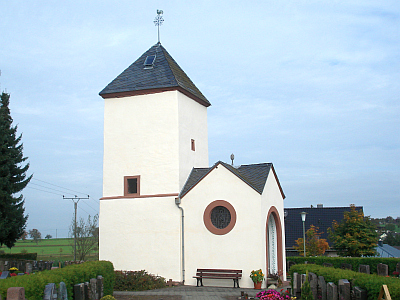 Im noch benutzten Kirchhof südlich außerhalb des Ortes auf einer Anhöhe gelegen. Nach dem Abbruch von Schiff, Chor und Glockengeschoß um 1870 nur noch die beiden Untergeschosse des Westturms erhalten, jetzt mit einem niedrigen Zeltdach abgedeckt. Die glatten Wandflächen nur durch ein Kaffgesims über dem Erdgeschoß gegliedert, spärlich verteilte Öffnungen. Auf der Nordseite eine Tür mit spätgotisch profilierter Einfassung, im Sturz geometrische Ornamente, Türflügel des 18. Jahrhunderts. [1]