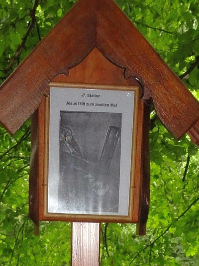 Kreuzweg mit 15 Stationen entlang des Lorscheider Baches als Geschenk zur 800-Jahr-Feier der Gemeinde. Die Stirnbretter wurden aus alten Kirchenbänken gefertigt. [1]