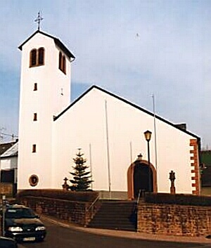 Die heutige Kirche wurde im Jahre 1756 als - für eine Pfarrkirche - zu kleine Kapelle errichtet. Nach jahrzehntelanger Planung beschloss man sich im Januar 1950 den Missstand zu beheben und die Kirche zu erweitern. Die wenigen, 1950 noch vorhandenen Ausstattungsstücke aus dem 18. und frühen 19. Jahrhundert wurden in den erweiterten Bau übernommen. Im Erweiterungsbereich wurden vom alten Bau die Werksteine der Eckquaderung, der Rundbogenfenster und des Westportals wiederverwendet.