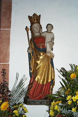 Die östlich an den Chor gebaute dreiseitig schließende Sakristei stammt wohl aus dem 17. oder 18. Jahrhundert; in der südöstlichen Schrägseite ist außen ein Kreuzigungsrelief des frühen 17. Jahrhundert eingelassen. Von der älteren Ausstattung blieb nur eine Muttergottes des 14. Jahrhundert und der der 1663 von Joh. Molitor (Inschrift) gefertigte Hauptaltar mit dem 1732 (Inschrift) angefügten hölzernen Trennwänden erhalten. Einfaches neugotisches Gestühl. [1]