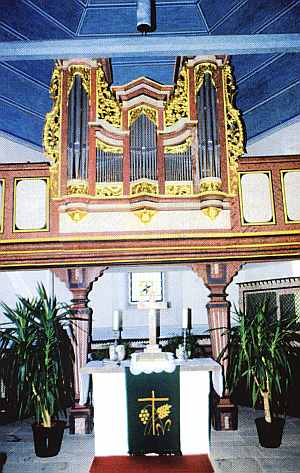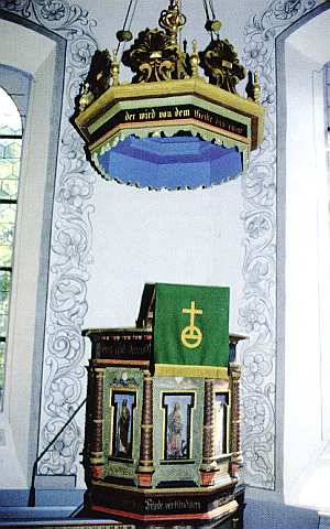 Die Kanzel stammt aus der Vorgängerkirche und hatte ihren Platz zunächst hinter dem gemauerten Altar. Sie wurde mit dem Einbau der Orgel an die Südwand gesetzt. Die einmanualige Orgel (9 Register) mit dem Barockprospekt stammt aus der berühmten Werkstatt Stumm aus Rhaunen-Sulzbach. Sie wurde 1745 direkt über den Altar in den Chor eingebaut und kostete 300 Taler und zwei Maß Korn.